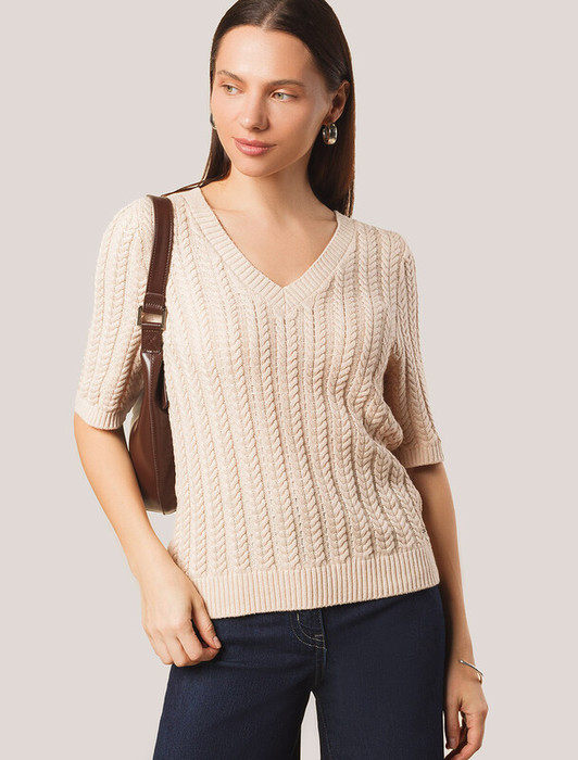 22.03 Vilatte Джемпер фактурной вязки из хлопка с кашемиром D39.349 бежевый мел