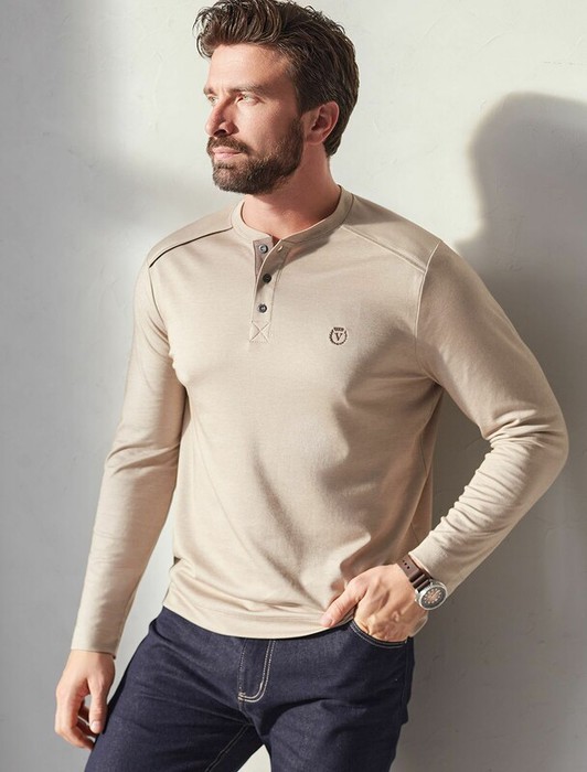 Джемпер хенли цвета хаки из полотна пике, состоящий из двух оттенков нити, создающем эффект меланж. Мягкая и дышащая ткань обеспечивает комфорт в течение всего дня, позволяя коже дышать и поддерживать оптимальную воздухопроницаемость. Материал тянется, обеспечивает долговечность и сохраняет презентабельный внешний вид даже после многократных стирок.