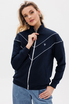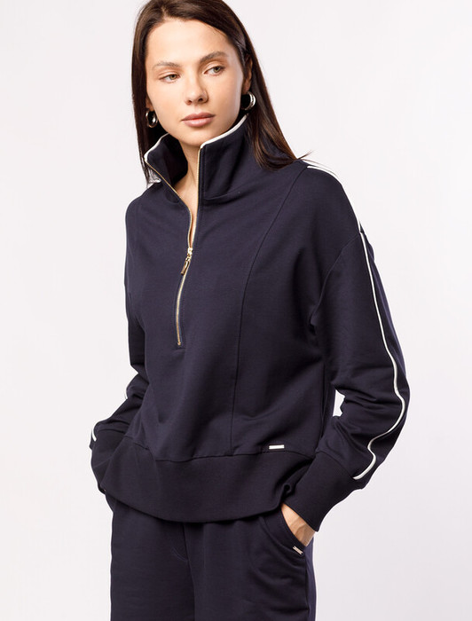 Джемпер  с воротом на молнии выполнен из эластичного футера двухнитки. Модель умеренно свободного кроя. По рукавам и воротнику кант из футера контрасного цвета. Изделие дополнено золотистым логотипом бренда. Сочетается в костюме с брюками D44.141, D44.142, шортами D48.009 и юбкой-шортами D46.041. Правила ухода: использовать жидкое моющее средство (гель для стирки), добавлять к нему кислородный пятновыводитель для цветных вещей, и салфетки (защита от окрашивания). Стирка при 30 градусах, отжим на максимальных оборотах.