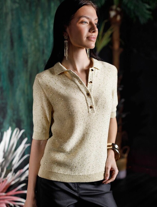 Легкий джемпер поло черного цвета с коротким руковом выполнен из хлопковой пряжи с вкраплением сияющих пайеток, что придает особую изысканность. Стильный джемпер связан изнанкой, пряжа отличается легкостью и приятной текстурой, совершенно не колется, обеспечивает комфорт даже при длительном использовании, а натуральные волокна поддерживают оптимальный температурный баланс. Крой полуприлегающий, подчеркивает женственный силуэт, а отложной воротничок с застежкой на золотистые пуговицы и манжеты на рукавах гармонично завершают дизайн, создающий аккуратный образ. Нарядный джемпер подойдет девушкам и женщинам больших размеров, в нем вы будете чувствовать себя уверенно и свободно в любой ситуации. Мерцающий эффект пайеток добавляет образу выразительности и индивудуальности. Сочетайте джемпер в романтическом образе с пышной юбкой, в более строгом с широкими брюками. С этим поло легко создать премиальный лук в стиле old money. Мерцающее полотно добавляет особого шарма вашему образу, делая его уместным как на празд
