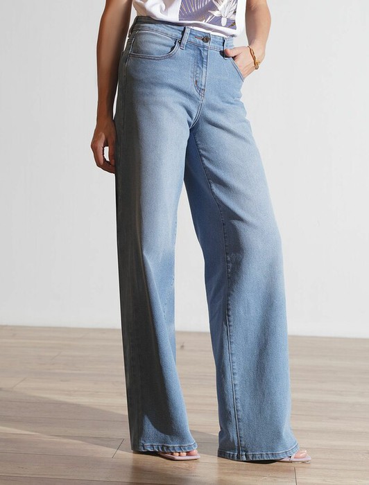 Стильные джинсы трубы синего цвета цвета прямого кроя выполнены из эластичного денима плотностью 12,3 OZ, что делает их особенно удобными для повседневной носки. Джинсы правильного кроя визуально вытягивают силуэт, благодаря эластану в составе аккуратно садятся на любую фигуру, подчеркивая достоинства и обеспечивают максимальный комфорт в течение дня, не сковывая движения. Широкая размерная линейка подходит для разных типов фигур: свободные джинсы комфортны как для обладательниц пышных форм, так и для худеньких. Вы сможете подабрать джинсы на низкий или высокий рост. Джинсы идеально держат форму даже при активном движении и не вытягиваются после долгой носки. Качественная надежная фурнитура делает эти джинсы премиальными.