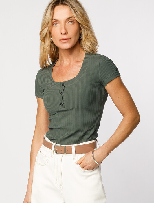 Футболка выполнена из трикотажа в широкий рубчик. Модель с квадратным вырезом дополнена декоративными пуговицами.  Эластичный хлопковый трикотаж сидит по фигуре, не сковывает движений и очень комфортный в носке. Фактура вертикальных полос визуально стройнит и вытягивает силуэт. Базовое изделие хорошо впишется в любой гардероб. Идеально подходит для многослойных образов.