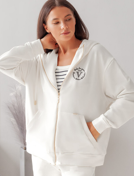 Худи на молнии с золотистой фурнитурой выполнено из премиального футера трехнитки без начеса. Изделие украсили принтом в виде логотипа бренда. Мягкий и уютный трикотаж с добавлением эластана гарантирует абсолютный комфорт даже в прохладное время года, не ограничивая свободу движений. Модель сочетается в костюме с брюками D44.079 и D44.089