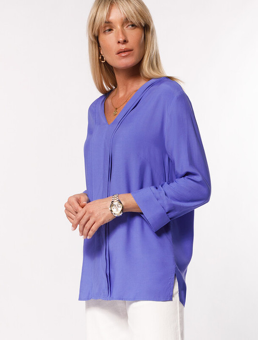 Летящая блузка выполнена из премиальной вискозы и лиоцелла. Лаконичная модель с полуматовым блеском украшена мягким воланом. Приятная на ощупь ткань охлаждает кожу в жаркую погоду. Отлично впишется в нестрогий офисный дресс-код или в расслабленном повседневном образе с джинсами и юбками.