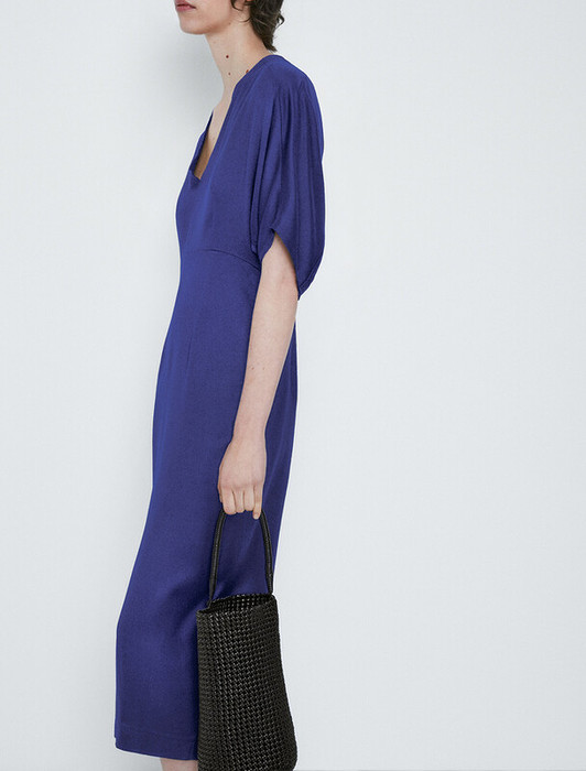 Платье с глубоким V-вырезом и рукавом «летучая мышь» выполнено из тончайших нитей плотного сатина, плетение которых создает полуматовый блеск, напоминающий натуральный шёлк. Модель с длинными глубокими вытачками спереди и сзади выглядит скульптурно, но за счет струящейся ткани сохраняется плавность силуэта. Ткань почти не мнется и имеет легкий вес. Комфортная длина ниже колена и застежка на молнию.