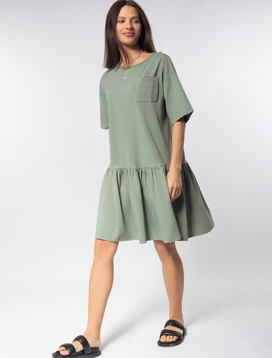 Платье выполнено из премиального хлопка. Трендовый верх как у футболки с карманом, задает лаконичный стиль, а пышный низ вносит в образ романтичный дух. За счет эластана в изделии очень комфортно. Подходит для любой фигуры. Изделие дополнено металлическим логотипом бренда.