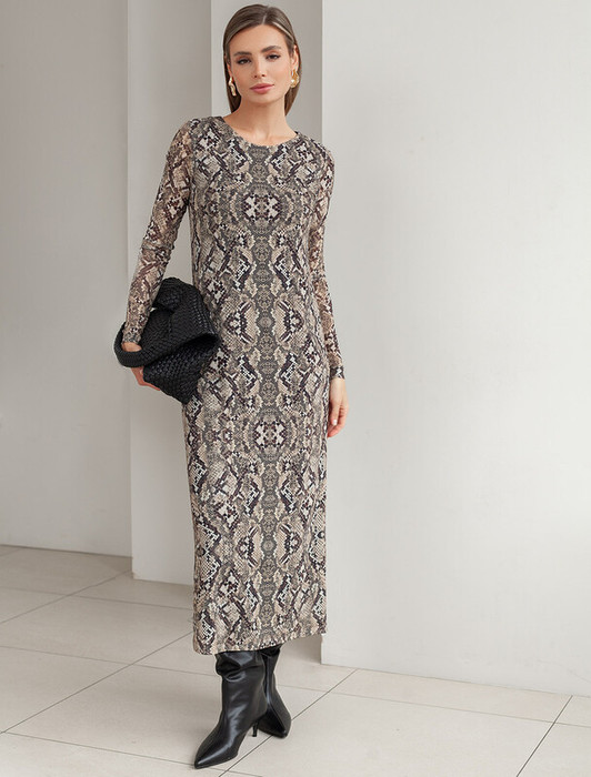 Совместные покупки Нижний Тагил Женская одежда Платья — Vilatte Платье из сетки с подкладкой D22.238 коричневый-бежевый змея