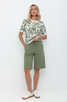 Шорты с легкой декоративной стиркой выполнены из эластичного денима. Модель с ложным гульфиком и поясом из эластичной резинки со шнурком из основного полотна. За счет эластана изделие хорошо тянется и гарантирует комфорт и формоустойчивость. Подходит для любой фигуры.