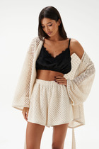 Шорты выполнены из футера двухнитки с эластаном. Модель прямого кроя дополнена боковыми карманами и одним задним карманом.  Пояс выполнен из эластичного трикотажа в рубчик. В пояс вставлен плоский хлопковый шнур в тон изделия с серебристыми наконечниками. Изделие дополнено металлическим логотипом бренда. Сочетается в костюме с жакетом D49.078, джемпером D49.079, D49.080 и футболкой D49.081