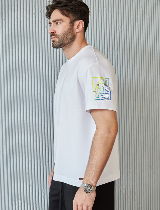 Футболка свободного кроя выполнена из премиального хлопка. Авторский принт нанесен красками с устойчивым покрытием. Благодаря эластану, носить изделие очень комфортно, и оно сохранит свой безупречный вид в течение долгого времени. На рукаве нашивка из эко-кожи с логотипом бренда.