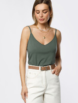 Топ с V-вырезом выполнен из премиального хлопка. Модель дополнена регулируемыми бретелями, позволяющими носить изделие на нужном уровне. Эластичный материал гарантирует комфорт и формоустойчивость. Из украшений металлический логотип бренда.