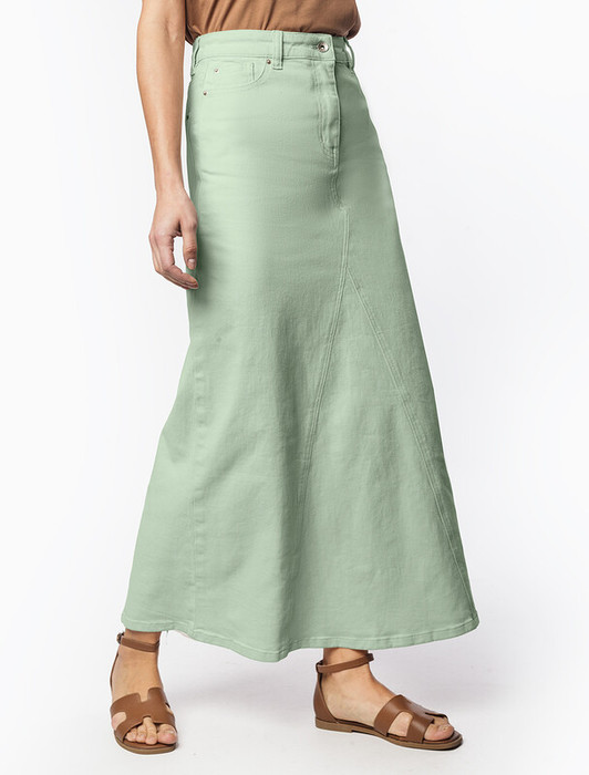 Юбка А-силуэта выполнена из денима с эластаном. Модель с посадкой на талии расширяется к низу за счет вставок из декоративных клиньев, расположенных спереди и сзади. Изделие дополнено пятью карманами как у джинс и брендированным патчем из эко-кожи. Сочетается в комплекте с курткой D51.033