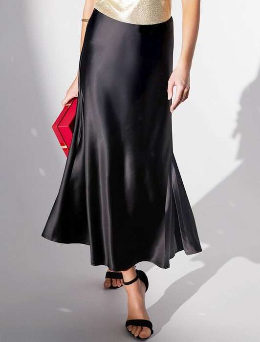 Юбка миди черного цвета с разрезом из струящегося плотного сатина — находка для модниц, ценящих элегантную классику и современный стиль. Модный крой длинной юбки подчеркивает фигуру, а мягкий эластичный пояс обеспечивает дополнительный комфорт на протяжении всего дня. Благодаря продуманному крою, юбка хорошо сидит на фигуре и подчеркивает силуэт без лишних деталей, подойдет для обладательниц пышных форм и девушек маленьких размеров. Шелковистая текстура материала приятно ощущается на коже, не просвечивает и сохраняет форму даже после длительной носки. Гладкая поверхность добавляет благородного блеска, делая образ неповторимым и шикарным в любой ситуации. Струящийся плотный сатин отличается устойчивостью к сминанию: юбка  не мнется, что позволяет выглядеть безупречно на работе, встрече или прогулке. Атласная юбка придает образу элегантный и благородный вид, а разрез добавляет легкую динамичность и создает утонченный акцент на линии ног, сохраняя при этом сдержанную женственность. Юбка визуально вытягивает силу