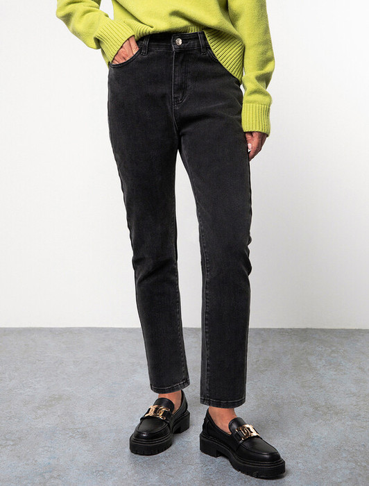 Темно-серые джинсы из плотного прочного хлопка с добавлением нитей эластана. Укороченная модель изящно открывает лодыжки. Высокая посадка грамотно подчеркивает силуэт. Данная модель легко и безупречно поможет составить модный образ вместе с трикотажным поло, свободной блузкой, футболкой или жакетом.
