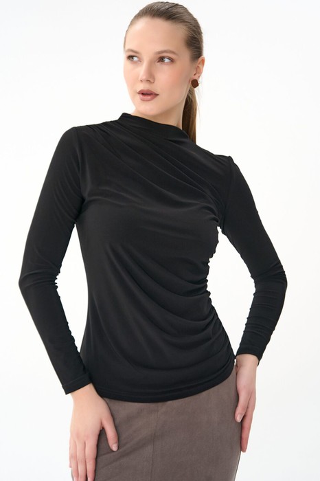 — Особенность модели — асимметричная драпировка по передней части, создающая мягкие складки и визуально вытягивающая верх.