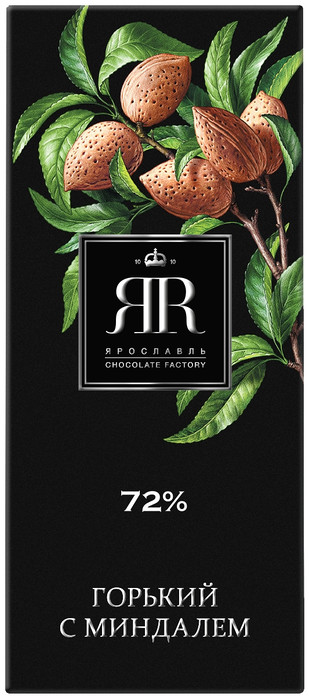 Шоколад горький с кусочками ореха миндаля. 72%Потрясающее лакомство с приятной горчинкой и ярким вкусом орехов. Шоколад ЯR буквально тает во рту, благодаря использованию африканских какао-бобов сорта Criollo. Изготовлен по специальной рецептуре, соединив традиции ярославских кондитеров с современными швейцарскими технологиями.