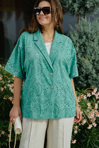 Бренд белорусской женской одежды больших размеров Anastasia представляет элегантный кружевной жакет. Жакет прямого силуэта со спущенным плечом. Рукав 3/4 длины. Застежка на пели и пуговицы, воротник пиджачного типа. По полочке идут накладные карманы, низ фигурный. Стильный жакет оверсайз невероятно удобный и практичный. Отличный вариант в офис, в школу, на работу, на каждый день. Жакет выгодно подчеркнет достоинства фигуры и скроет недостатки, подходит для девушек любых размеров одежды. Комфортный удобный, хорошая посадка и современный дизайн. Длина по спинке: (52-60) - 77 см, (62-68) - 79 см. Длина рукава: (52-68) - 30 см