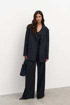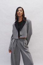 Жакет с застёжкой спереди на петли и пуговицы, с пиджачным воротником и втачными двухшовными рукавами со шлицами и акцентными пуговицами. По переду выполнены боковые карманы с клапанами и нагрудный накладной карман с съёмным дизайнерским украшением, спинка со швами.