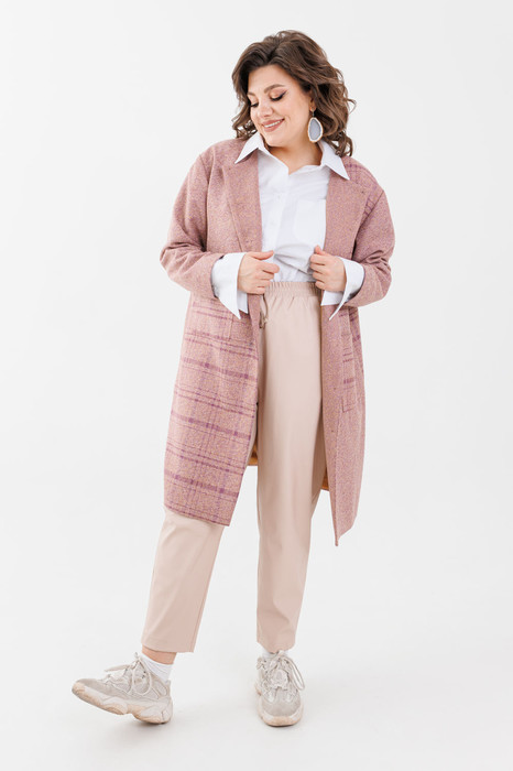 Жакет женский Домино, длина ниже колена. На подкладке. Спущенная линия плеча, рукав длинный. Округлая горловина. Накладные карманы по переду на уровне талии. По переду застежка на петли пуговицы. Жакет резной по вертикали и по линии талии.