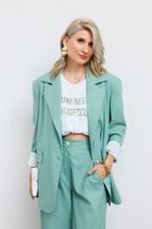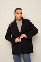 Жакет прямого кроя выполнен из черного полотна. Характеристики: прямой крой, подплечники, подкладка, отложной воротник с лацканом, застежка центральная на петлю пуговицу, пуговица декорирована тканью основного изделия, по переду карманы с клапанами, рукав втачной по низу рукава пуговички, в среднем шве заднего полотна изделия разрез 23 см. Длина по спинке 78 см, длина рукава 63 см.