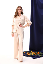Жакет полуприлегающего силуэта выполнен из яркого текстурного полотна розового цвета, с декоративными элементами. Характеристики: V образный вырез горловины, застежка центральная на петли пуговицы (декорированы тканью основного изделия), талиевые вытачки по спинке жакета, по переду два накладных кармана с клапанами, рукав прямого кроя. Длина по спинке 48 см, длина рукава 63 см.