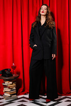 Жакет прямого свободного кроя, выполнен из ворсистой ткани серого цвета. Характеристики: горловина стойка, застежка центральнаяна петли пуговицы,рукав прямой, по плечевому шву пата на пуговице, на левом рукаве нашивка Annete. Длина по спинке 46 см, длина рукава 62 см.
