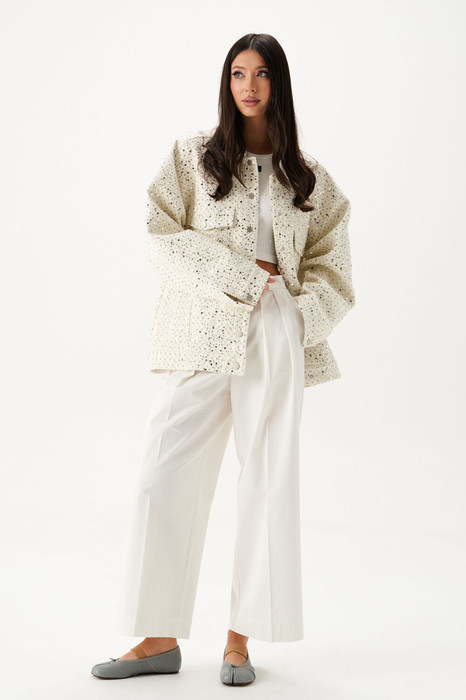 Жакет свободного кроя. Выполнен из джинсовой ткани белого цвета на люрексной основе с перфорацией и пайетками. Воротник отложной. Рукав втачной, немного спущен. На рукаве манжета с кнопкой. Застежка центральная - кнопки. На уровне линии груди карманы с клапаном, внизу карманы с листочкой. Спинка отрезная. По низу изделия отрезная планка-пояс. На планке два хлястика с кнопками. Изделие без подкладки. Длина спинки 71 см. Длина рукава от линии втачивания 60 см