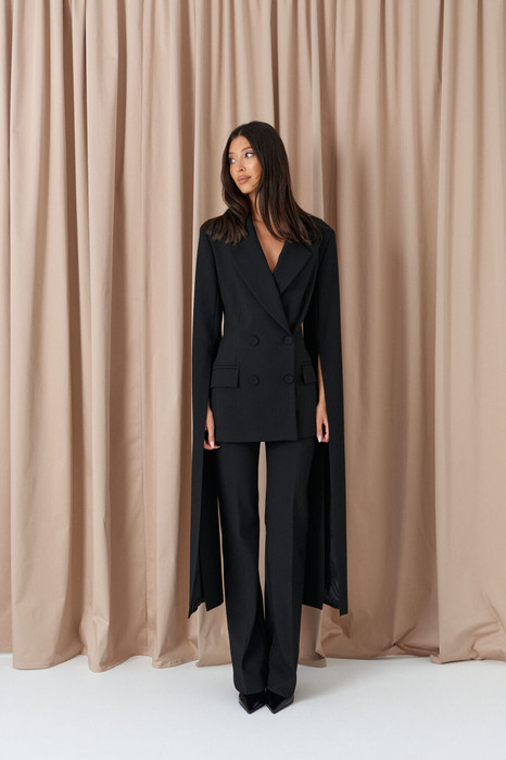 Жакет двубортный прилегающего силуэта. Выполнен из костюмной ткани чёрного цвета. С подкладкой. Воротник отложной, с лацканами. Застёжка центральная пуговицы. Рукав акцентный, удлинённый, с разрезом, с расширением к низу. По переду карманы с клапаном. Длина спинки 70 см. Длина рукава от линии втачивания 119 см. Длина разреза на рукаве 81 см