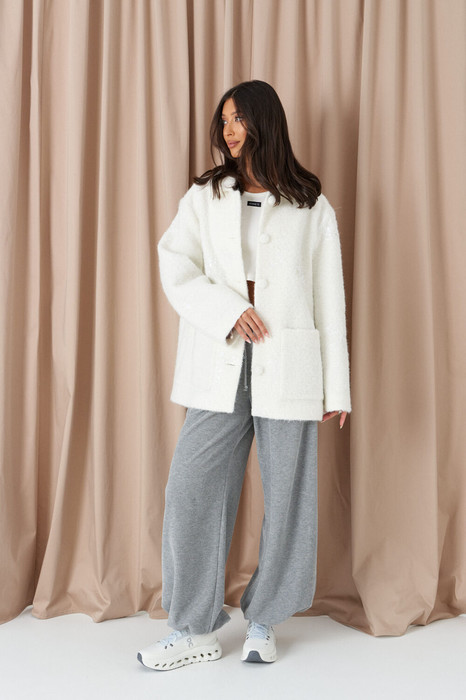 Жакет прямого свободного кроя выполнен из полотна ворсистой тектуры белого цвета с декоративной вышивкой из пайеток.Характеристики: прямой свободный крой,брендированная подкладка, застежки центральные на петли - пуговицы, по переду нашиты функциональные карманы, рукав втачной. Длина по спинке 74см, длина рукава от горловины 77 см.
