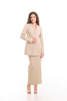 Жакет полуприталенного силуэта выполнен из костюмной ткани бордового цвета. Характеристики: полуприталенный силуэт, двубортный, брендированная подкладка, подплечники, овальный вырез горловины, по переду функциональные карманы с клапаном, рукав втачной, по низу рукава нашиты пуговички. Длина по спинке 77, длина рукава от края горловины 75 см.