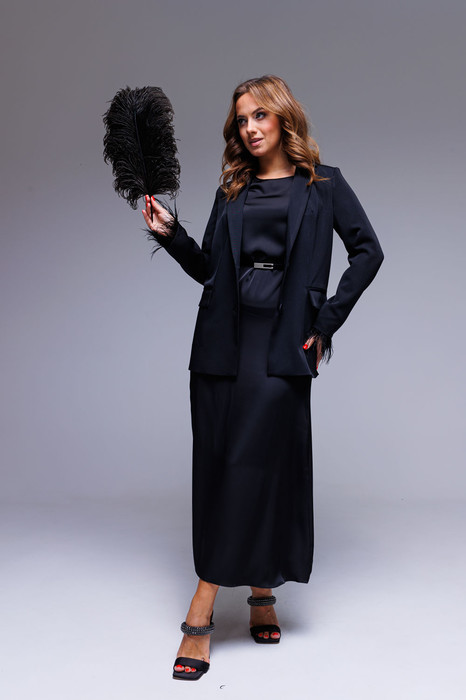 Жакет черный однобортный с перьями съёмными на рукавах