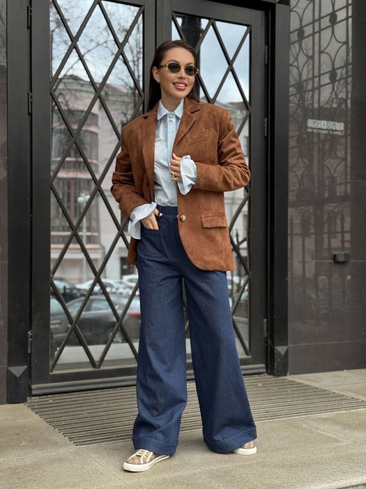 Жакет однобортный классического силуэта, на подкладке. Борта по низу имеют закругленную форму.Рукав втачной, прямой.Обработаны 2 кармана с клапанами и один карман с листочкой