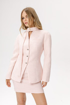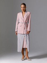 Двубортный жакет на подкладке, прямого силуэта. Выолнен из замшевой ткани. Обработаны прорезные карманы по переду. Рукава втачные одноосновные, обработаны шлицей.