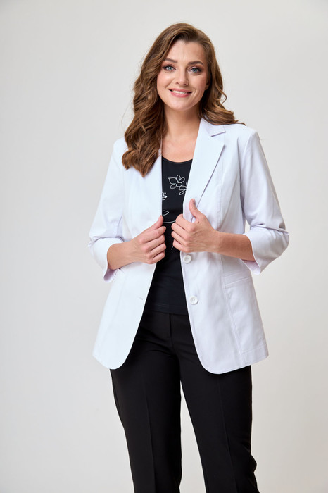 Жакет женский удлиненный, полуприлегающего силуэта с центральной бортовой застежкой на пуговицы до линии перегиба лацкана. Спереди рельефные швы от плечевого шва, отрезной бочок и карман с листочкой. по низу переда настрочен декор. Спинка с рельефами от плечевого шва. Рукав втачной, двухшовный, 3/4, с небольшим разрезом в локтевом шве. Воротник пиджачного типа. Жакет выполнен из х/б ткани, без подкладки. Длина рукава 50, длина по спинке 68 см.