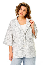 Жакет женский удлиненный, из трикотажной ткани, перед жакета на подкладке, полуприлегающего силуэта с центральной бортовой застежкой на пуговицы до линии перегиба лацкана. Спереди рельефные швы от плечевого шва, отрезной бочок и карман с клапаном. Спинка с рельефами от плечевого шва. Рукав втачной, двухшовный. Воротник пиджачного типа. Длина по спинке 70, длина рукава 61.