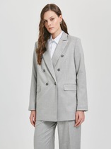 Жакет женский удлиненный, из текстильной ткани, на подкладке, полуприлегающего силуэта с центральной бортовой застежкой на пуговицы до линии перегиба лацкана. Спереди рельефные швы от плечевого шва, отрезной бочок и карман с клапаном. Спинка с рельефами от плечевого шва. Рукав втачной, двухшовный. Воротник пиджачного типа. Длина по спинке 66 см, длина рукава 62 см.