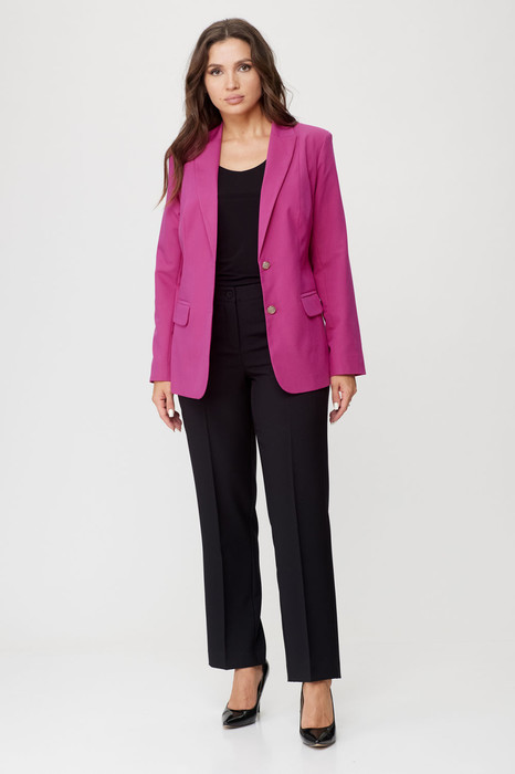 Жакет женский удлиненный, из текстильной ткани, на подкладке, полуприлегающего силуэта с центральной бортовой застежкой на пуговицы до линии перегиба лацкана. Спереди рельефные швы от плечевого шва, отрезной бочок и карман с клапаном. Спинка с рельефами от плечевого шва. Рукав втачной, двухшовный, по низу рукава обработана шлица на петли-пуговицы. Воротник пиджачного типа. Длина по спинке 66 см, длина рукава 62 см.