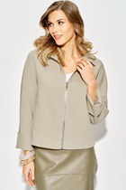 Жакет женский удлиненный, полуприлегающего силуэта с центральной бортовой застежкой на пуговицы до линии перегиба лацкана. Спереди рельефные швы от плечевого шва, отрезной бочок и карман с клапаном. Спинка с рельефами от плечевого шва. Рукав втачной, двухшовный, 3/4, с небольшим разрезом в локтевом шве. Воротник пиджачного типа. Перед жакета на подкладке. Длина рукава 50, длина по спинке 68 см.