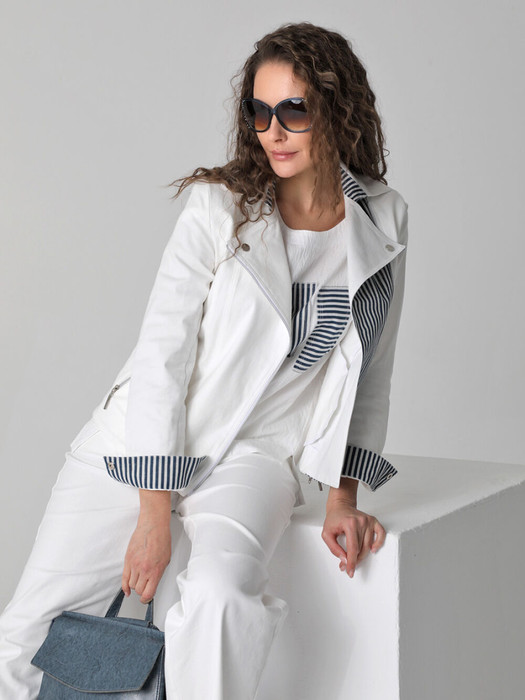 Женский жакет-косуха - стильная одежда, которая дополнит Ваш гардероб. Летний безподкладочный жакет застегивается на молнию. Низ втачного рукава оформлен манжетой на кнопке. Воротник классический для такого покроя - отложной с лацканами. Есть удобные карманы с молнией. Прямой силуэт подойдет для женщин и девушек с любым типом фигуры. Женский стильный пиджак на весну, лето и осень выполнен из плотного хлопка с льняными вставками. Ткань под джинсу износостойкая и приятная на ощупь. Она хорошо дышит.  Такой жакет можно носить в офис или на прогулку. Косуха хорошо комплектуется с платьем, юбкой, брюками или джинсами. В нашей летней коллекции можно подобрать компаньоны к этой легкой куртке: блуза (арт.25232), узкие брюки (арт. 25240) и широкие из такого же хлопка (арт.25242). Фантазируйте с аксессуарами и обувью, и Ваше лето будет стильным и комфортным!