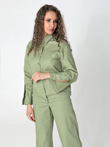 Куртка-жакет прямого силуэта  БЕЗ ПОДКЛАДКИ подходит для девушек и женщин любого возраста. Застежка - на кнопки. Воротник рубашечного типа на стойке. Удобно расположенные в рельефных швах карманы подходят для хранения мелочей. Рукава рубашечного кроя с удлиненной застежкой на кнопках гармонично дополняют стиль куртки.  Женский пиджак на весну, лето и осень выполнен из плотного хлопка.  Ткань хорошо "дышит". Такой летний жакет-рубашку с регулировкой ширины по низу, можно удачно сочетать с модными широкими брюками (арт. 25242), выполненными из такого же хлопка.  В весенний, летний и осенний сезон этот жакет можно носить в офис, на прогулку, на вечерние встречи с друзьями. Фантазируйте с яркими акцентами в виде аксессуаров,  и Ваше лето будет стильным и комфортным!