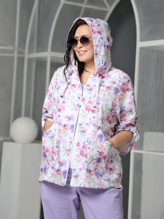Летний блузон из  хлопка с актуальным эффектом вышивки украсит гардероб женщин и девушек любого возраста. Такая легкая курточка прямого силуэта  с укороченными рукавами покроя реглан хорошо дополнит образ как с платьем или с юбкой, так и с брюками или с шортами. Застежка на двухзамковую молнию позволяет расстегнуть блузу как сверху, так и снизу. Удобно расположенные втачные карманы подходят для хранения мелочей. Фантазируйте с образами и аксессуарами, и эта стильная курточка выручит Вас летним вечером в городе и на отдыхе.