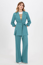 Неширокий пояс из основной ткани с завязкой через кольца нежно обхватывает талию, удерживая объём жакета.