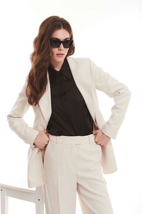 Жакет женский, однобортный, полуприлегающего силуэта, на подкладке. Застежка на одну петлю и пуговицу. На переде карманы «в рамку». Рукава втачные, в нижней части локтевого шва отлетная шлица на 5 пуговиц и петель. Воротник и лацкана отложные. В нижней части среднего шва спинки шлица.