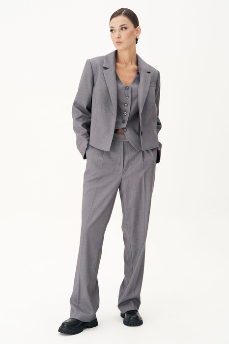 Жакет полуприлегающего силуэт, втачного покроя с центральной застёжкой и классическим английским воротником. Полочка с нагрудной вытачкой, отрезным бочком и прорезным верхним карманом с листочкой. Спинка с центральным швом и плечевыми вытачками. Рукав двухшовный с отлетной шлицей и отделочными пуговицами.