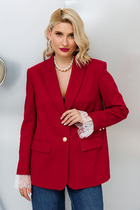 Жакет свободного расширенного силуэта, втачного покроя с центральной застёжкой и классическим английским воротником. Полочка с отрезным бочком, нагрудной вытачкой и прорезным карманом с клапаном. Спинка с центральным швом, шлицей и отрезным бочком. Рукав двухшовный с отлетной шлицей. Элегантность и нарядность жакету придает ткань в мелкую рассыпную пайетку.