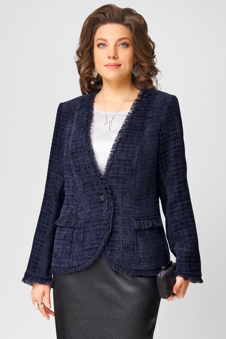 Однобортная застёжка на пуговицу, рельефные линии по полочке и спинке подчёркивают фигуру. Декоративная трепка по краю борта, низу изделия и рукавам добавляет фактурности и оригинальности.