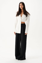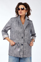 Жакет полуприлегающего силуэта, на подкладке; воротник пиджачного типа; рукава втачные; по переду функциональные прорезные карманы; застежка двубортная на петли и пуговицы.