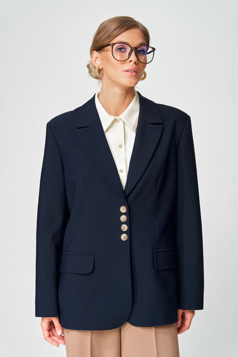 Жакет прямого свободного силуэта оверсайз. Воротник пиджачного типа, застежка обнобортная на 4 петли и пуговицы. Перед с талиевой вытачкой и карманом с клапаном в рамку, с рельефом. Спинка со средним швом и рельефами, в рельефах шлица. Рукав втачной одношовный со шлицей и 4-мя пуговицами. Жакет на подкладке. Длина жакета- 70 см, длина рукава жакета - 60 м. Данная модель прекрасно сочетается с другими моделями из нашей коллекции 15409, 35204. Создайте гармоничный образ, комбинируя эти изделия!