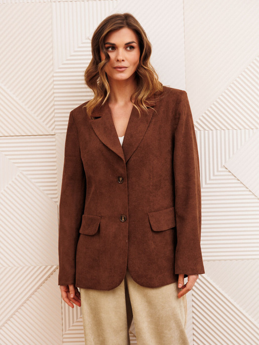 Жакет полуприлегающего силуэта из мягкой вельветовыой  ткани.  Застежка однобортная на две пуговицы, воротник пиджачного типа.  Перед с талиевой вытачкой, рельефом и декоративным клапаном. Спинка с рельефами из проймы и средним швом.  Рукав втачной двухшовный. Жакет на подкладке. Длина жакета - 68 см, длина рукава жакета - 60 см.