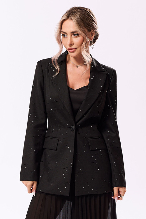 Жакет с центральной застежкой на петли и пуговицы, без воротника, с втачным воротником и отложными лацканами пиджачного типа. По переду с фигурными подрезами, рельефами и талиевыми вытачками. По спинке со средним швом, рельефами, выходящими из проймы. Рукав втачной, длинный.